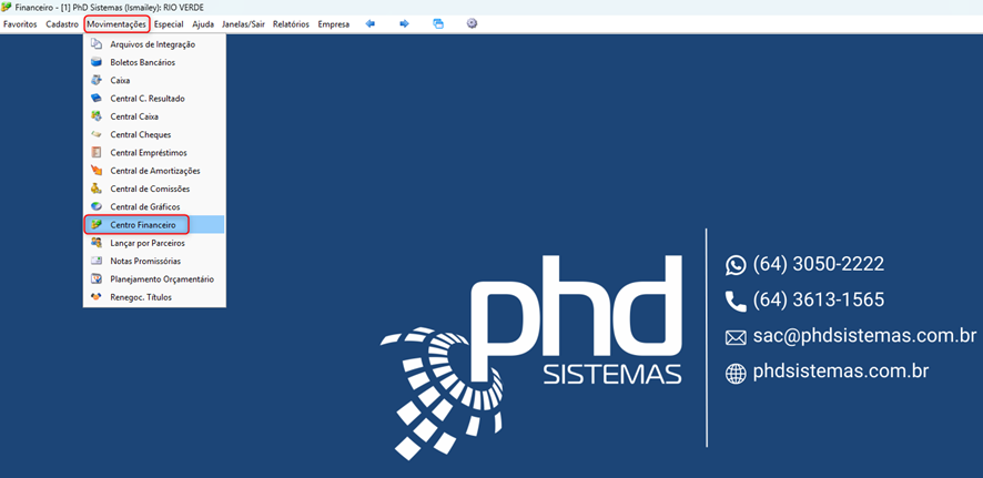 - 1. Acesse o módulo Financeiro → Movimentações → Centro Financeiro.