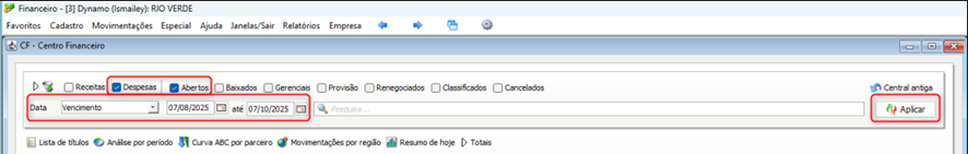 - 2. Filtre Despesas, Abertas e informe o período de vencimento, em seguida Clique no botão <APLICAR>.